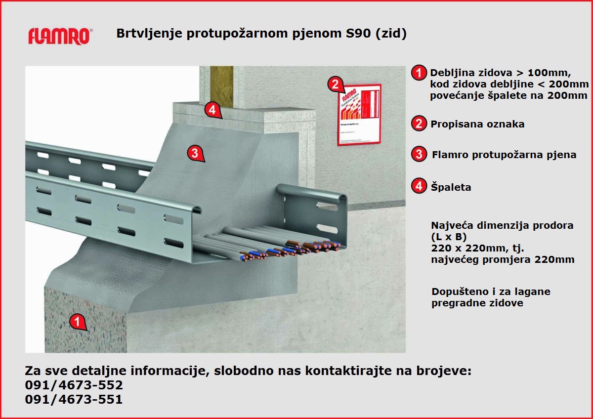 Elastična protupožarna pjena za zidne i stropne prodore pojedinačnih kabela, kabela u snopovima i kabela svih vrsta (promjera do 32 mm kod S 90), uključujući i optička vlakna i nosače kabela (kabelske police, kabelske ljestve, kabelski vodiči) od čelika, aluminija ili plastike. Pojedine čelične i plastične cijevi s kabelima promjera < 15 mm