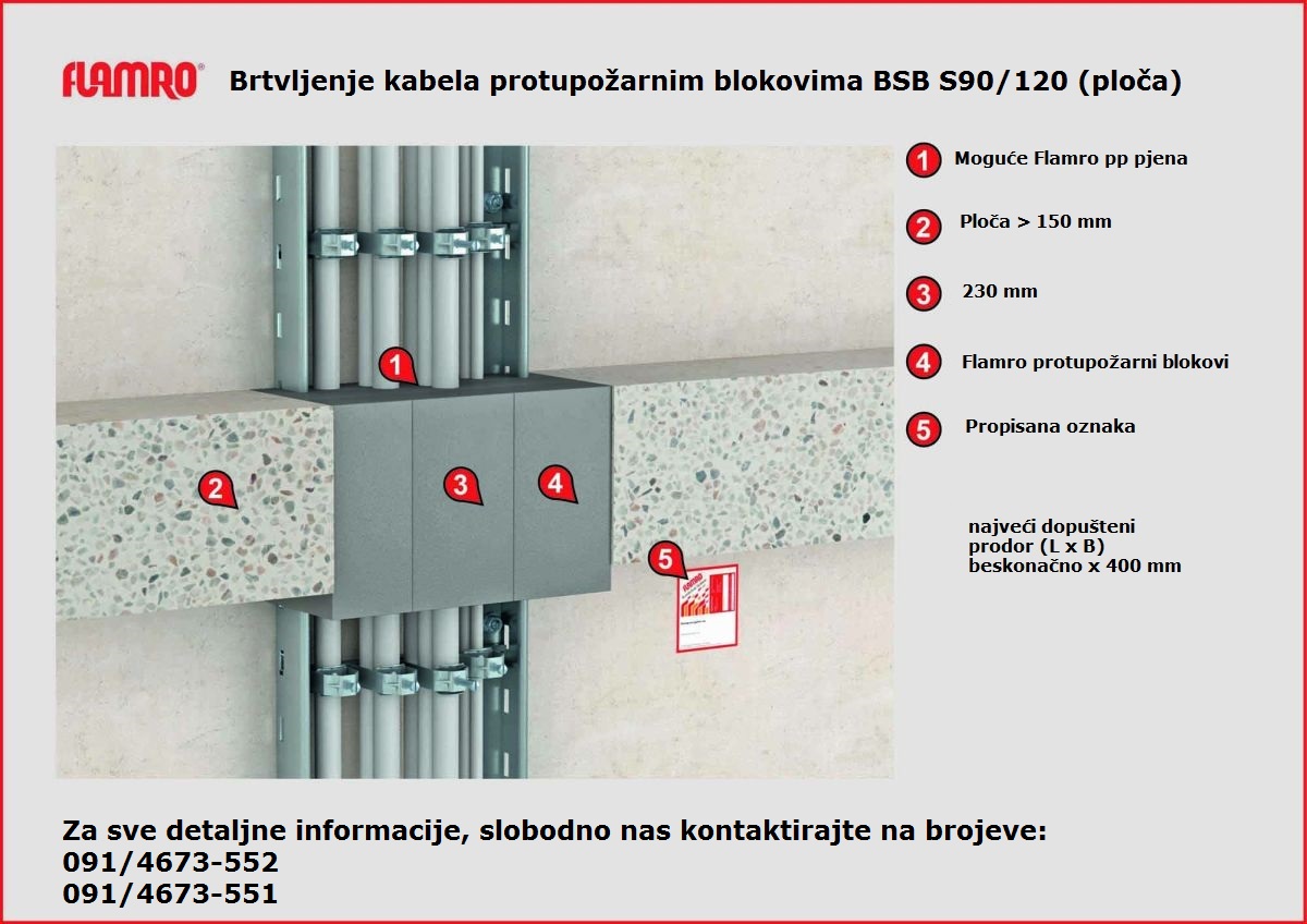 Elastični protupožarni blokovi za brtvljenje zidnih i stropnih prodora pojedinačnih kabela, kabela u snopovima svih vrsta (uključujući i optičke kabele). Bez ograničavanja ukupnog presjeka svakog kabela, kao i nosača (kabelske police, nosači, ljestve) od čelika, aluminija ili plastike. Pojedinačne čelične i plastične cijevi promjera <15 mm.